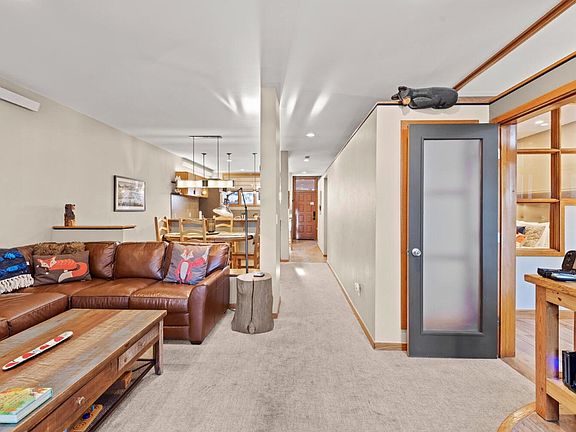 On the River. 2B/2B mountain modern condo in the heart of Frisco just one block from Main Street and free Summit Stage bus stop. Complete designer overhaul including custom closets with ample storage. Thoughtful kitchen redesign with stainless steel Kitchen Aid appliances and beverage fridge. Enjoy the wood burning fireplace, and deck overlooking Ten Mile creek with views of surrounding mountains. Club house with hot tub, workout machines, and sauna. A must see.