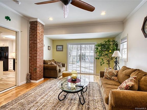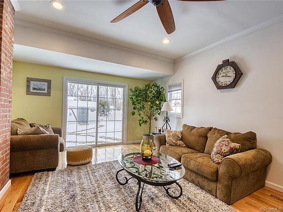 This remarkable Ranch in one of Plainville's most desirable neighborhoods has thoughtful and detailed updates throughout. The entry from the charming front porch brings you into a living room addition that features hardwood floors, recessed lighting, ceiling fan and slider to the rear yard. The kitchen features Martin cabinets, granite counters, under cabinet lighting, skylight, tile floor and copper finish sink and an eat in area with another slider to the large rear composite deck. The original family room is set up as a large formal dining room with a beautiful bow window and wood floors that stretch throughout the rest of the home. Other details include crown molding, chair rail, premium moldings, updated interior doors, updated entry doors, newer energy efficient windows and other details that provide a feeling of premium finishes throughout. A private deck with trellis accessed through a slider in the bedroom offers a private retreat, as does the large lower level family room, or the 24x14 shed finished off as a great workshop or hide away. Outside there is easy care vinyl siding, vinyl privacy fence, composite front door entry steps, a 2nd shed for tool and toy storage, a firepit, and room to play on this quarter acre corner lot. Make your appointment today before it's gone.