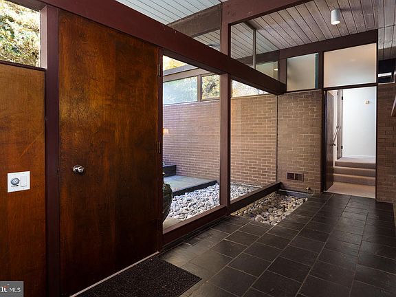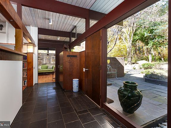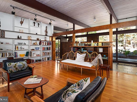 Vanguard mid-century design perfectly befits a peaceful Princeton cul de sac with woodsy paths connecting to the campus of Stuart Country Day School, and the Mountain Lake watershed beyond. First commissioned by pioneering physicist Roger Dashen, this striking modernist home likely came to be when Dr. Dashen encountered the work of architect Thaddeus Longstreth at the Institute for Advanced Study, where he had built several commissioned works. Princeton-trained Longstreth first came to prominence after serving as an assistant to and later associate of modernist master Richard Neutra, collaborating on Neutra’s Kaufman house in the Palm Springs desert. The influence is particularly notable on Hardy Drive in the ways Longstreth incorporates environment throughout the plan, sometimes seeming to eliminate the line between the interior and the extended living spaces outdoors. Massive windows, protected gardens and Zen inspired terraces interact harmoniously with a surrounding clearing that gives way gradually to deeper forest. A slate entry leads to hardwood flooring in the living room, partially separated by built-ins opposite a gas fireplace. In the dining room, a whole wall of storage keeps entertaining supplies neatly organized. While the kitchen is ready to be brought up to today’s chef-level standards, the wood cabinetry is in good shape and the sunny breakfast room is oriented to capture morning light. A mudroom and half-bath are nearby. The family room opens to an intimate courtyard and a wide stone patio in back is ideal for entertaining, complete with a built-in grill. As the largest of four newly carpeted bedrooms, the dramatic primary suite truly basks in the serenity of the 2+ acre setting. Skylit bathrooms, a dressing room and a large laundry room complete the private wing. Public utilities and central A/C give a headstart on ushering this modernist home seamlessly into its next chapter.
