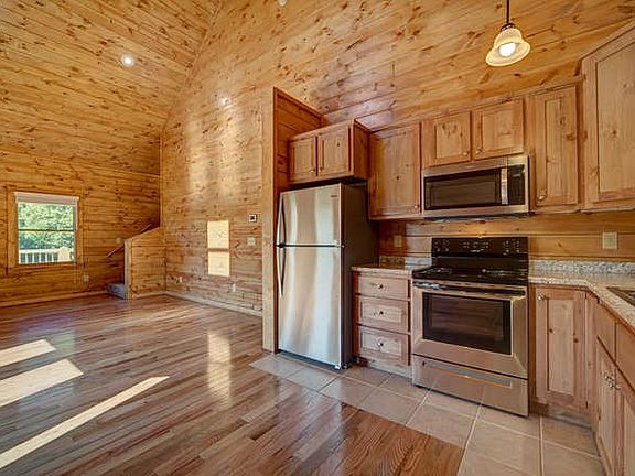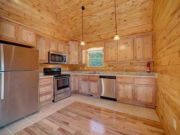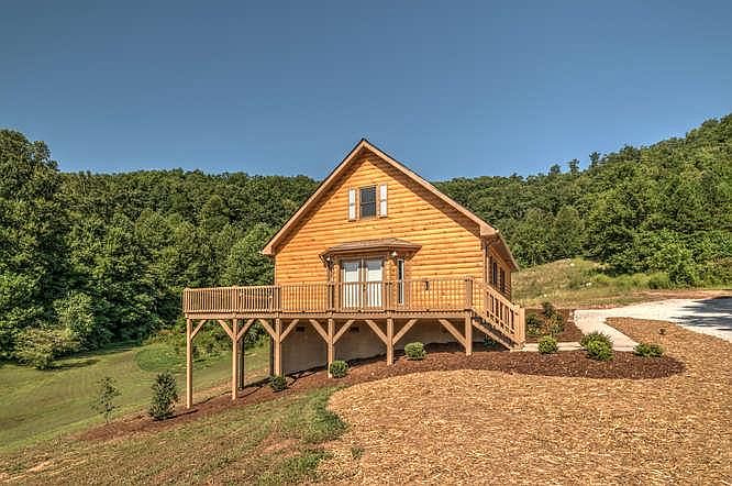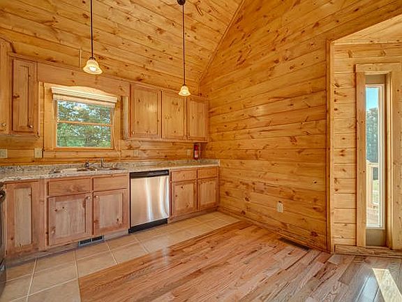 3 bedroom 2 bath log sided cabin on .92 gently sloping acres in pastoral setting with lawn/garden space & small fruit tree orchard. A concrete walk flanked w/simple landscaping keeps a tidy entrance into the main level of the cabin w/cathedral wood ceilings & wood walls. Bump out door & window detail from kitchen & Great Room to one of the decks to provide outdoor dining & enjoying the views. Bedrooms have drywall and carpet. Master bedroom has a private balcony for those quiet times at start & end of your days. Baths are of good size, have solid surface counters & good storage; master bath has double vanities. Zoned H/A for greater comfort. 8' x 32' workshop/storage beneath.