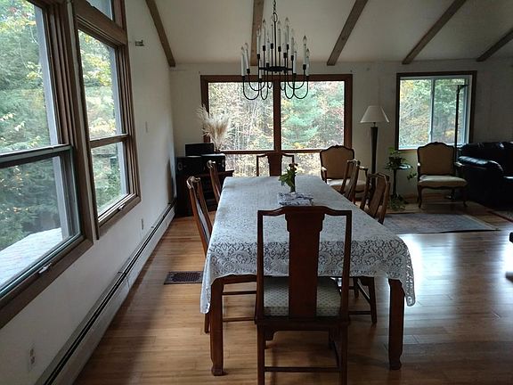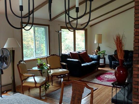 The main floor of this mid-century modern, deck style home features cathedral ceilings in the open space living/dining and kitchen area along with a 10' brick chimney with fireplace and brick oven in which you can bake your own bread, and 3 bedrooms and 2 baths. The lower level features a large family room with fireplace, 3 rooms to use as bedrooms, study, office etc and a bath, a laundry/utility room and a screened porch leading to a large deck. A large back yard leads to a bonus outbuilding for use as a kid's space, office, studio. Beautiful safe country setting for hikers, walkers, cyclists. Great neighbors! High speed satellite internet. Kitchen and baths could use updating.