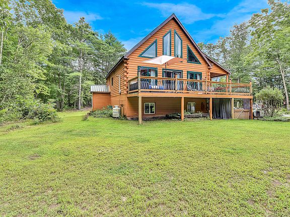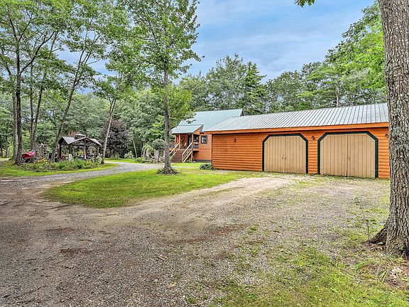 Gorgeous log cabin chalet, in the highly desired town of Turner, beautifully sets on it's own private & secluded peninsula. Surrounded by 4,000+/- feet of the Nezinscot River, this unique property offers many 4 season activities, swimming, kayaking, paddle boarding, fishing, boating, walking and skiing trails, cooking pizza in the outdoor firebrick oven and more! Enjoy the sights and sounds of wildlife while sitting on the dock or on the large wrap around deck. As you enter the welcoming entrance you will step into an open, spacious and light filled space that offers a delicate balance of wood logs and contemporary styling. On the main floor is a modern kitchen with island, dining and living rooms with water views, a sizable bedroom and full bath with tiled shower. Ascend the steps to the second floor which offers a half bath and stunning second bedroom with an open concept area that allows you to take in the breathtaking water views, or use as a retreat space. Downstairs provides a finished basement with two more bonus rooms, a utility room and a doghouse exit to outside. In addition to the home, there is a detached 3 vehicle garage/workshop with lots of space and opportunity.