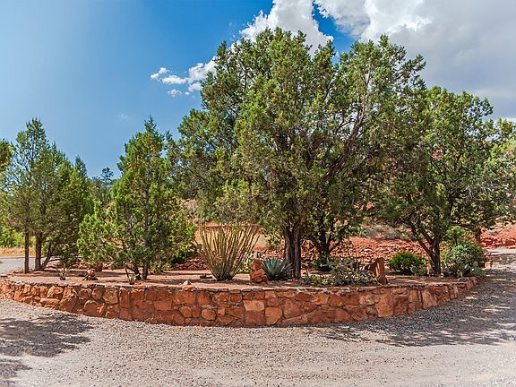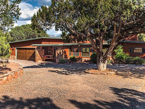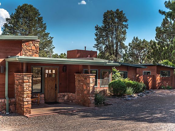 This charming red rock style home is what Sedona life is all about! Located in the popular subdivision of Kachina, this two-bedroom, two-bathroom home sits on .65 of an acre, has mature trees, and has been remodeled. With heated floors, hot tub, custom juniper work, and a one-bedroom/1bathroom guest casita, this house is a jewel box. Inset ceiling lights throughout the home, this house has beautiful lighting. Walking distance to the Sedona Library, several local cafes, and restaurants, this property has a great Sedona location! The expansive exterior pulls in design inspiration from Frank Lloyd Wright with its red rock facing and clean lines.