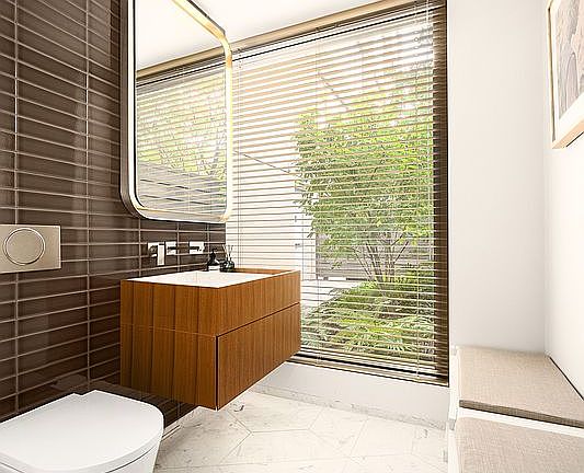 The expansive great room features floor-to-ceiling windows framing your private outdoor oasis . White oak floors and designer hardware run throughout, setting a refined tone.