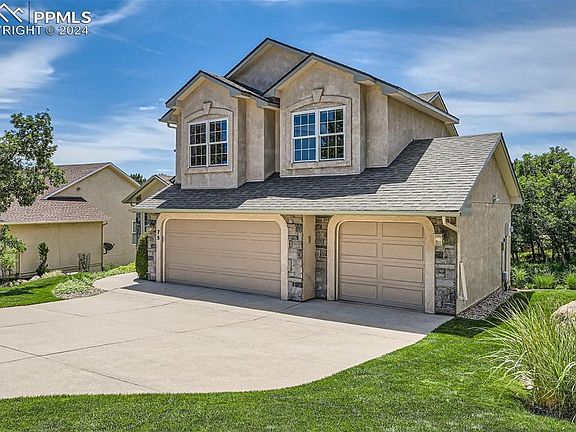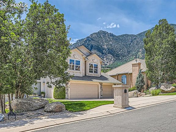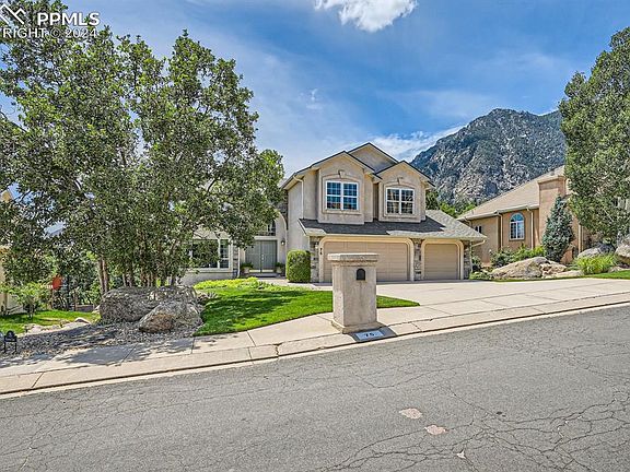 Beautiful 2-story home located in the exclusive neighborhood of Glen Oaks @ Broadmoor at the base of Cheyenne Mountain! This former Parade Home offers a grand floorplan with mountain views from the main level and private deck and city views from the upper level. Main level flows from the entry with spiral staircase and art ledges through the Great Room with high ceilings, gas fireplace, water feature, built-ins, and floor-to ceiling windows with towering views of Cheyenne Mountain. The Great Room then opens to a large light and bright kitchen with corian countertops, island, stainless steel appliances, pantry, and eat-in nook that walks out to the newly stained wood deck for an even better view of Cheyenne Mountain! The dining room with a curved tray ceiling, a laundry room with built-in sink, and a 1/2 bath finish the main level. Upper level features a double-door entry to the master suite with 3-sided fireplace, a spacious ensuite bath and a walk-in closet, two additional bedrooms, and a full hall bath. Finished lower level has a family room with thermostat-controlled gas fireplace and walk-out to the backyard, a bedroom with walk-in closet and attached full shared bath, another bedroom with double closets, a storage room, and the mechanical room. Home amenities include wood floors, central air, radon mitigation system, ceiling fans, window coverings, and 3-car attached garage with built-ins. Award-winning Cheyenne Mountain schools. No HOA dues. Landscaping gives great privacy from other homes with mature trees, massive boulders, and a seasonal creek in the backyard. Close to parks, trails, Fort Carson, Cheyenne Mountain/NORAD, shopping, and entertainment. Don't let this spectacular D-12 property get away!