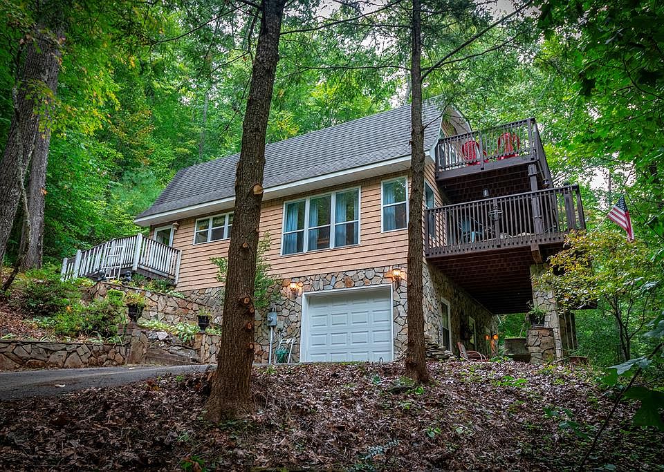 Morning Coffee on the covered deck couldn't be more TRANQUIL surrounded by the sounds of trilling birds and the gentle creek below: a HAVEN of privacy with a paved drive lined with Hosta, Native plants & Wildflowers. LOWER Entry from concrete patio into foyer leads to stairway up or to the partial finished Game Room or Studio in basement. Along with A single car garage finished with tile floors and workshop. MAIN LEVEL is OPEN Kitchen/Dining and Living area with room to take the party out onto the large covered deck. Laundry, Full Bath and Primary Bedroom with private covered deck. Huge windows offer Natural Light. The TOP FLOOR is getaway for kids or guest with a full bath, 2 bedrooms, bonus room leading out to TWO private decks. Stunning rock work surrounds this arts and crafts home with First Class Comforts. The circular driveway adds plenty of parking for family gatherings. Zoned Heating & Cooling. This family built vacation home has very UNIQUE and LOVING touches, but it would make a great vacation rental if you so wished. All furnishings and personal property CONVEYS so you can enjoy this bright and cheerful home immediately. QUALITY BUILT and LOVED WITH ATTENTION TO DETAIL!