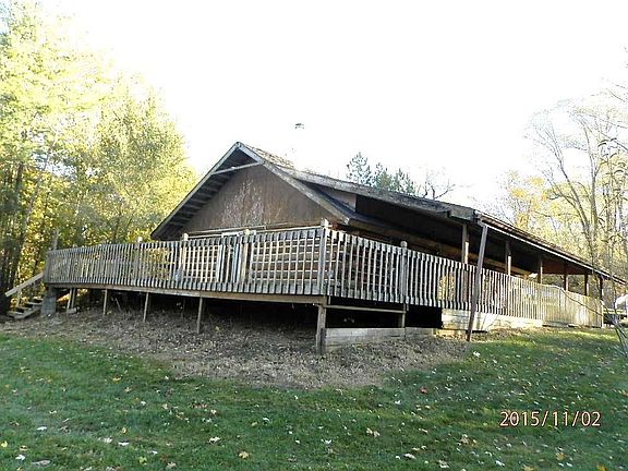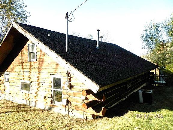1 story log cabin home in rural setting. Home has 2 bedrooms, 1 bath, large living room, loft, hardwood floors throughout, nice wrap around deck, and a 40 x 24 pole barn.