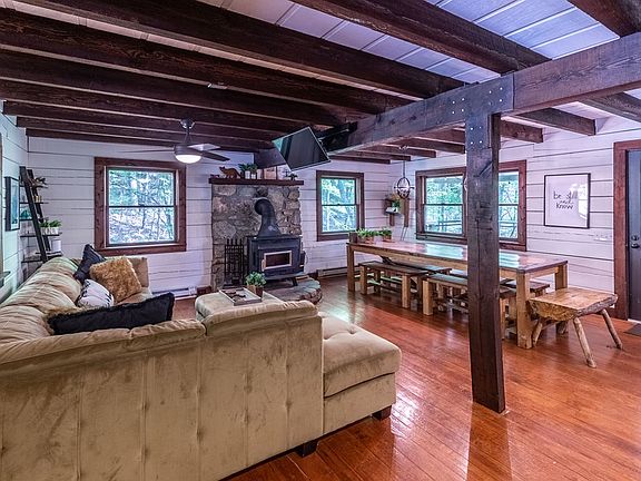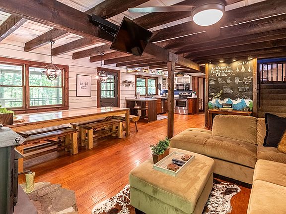 If you are looking to unwind, relax, slow down, and enjoy a little taste of mountain living, the home is for you. At this beautifully appointed log cabin, you can enjoy the mountains with the utmost privacy. This rustic cabin features 2 bedrooms, an upstairs bonus room, and 3-bathrooms. On the main level you will find a fully equipped kitchen, a beautifully furnished living room with a wood burning fireplace, dining room, and two, cozy bedrooms. Upstairs is a bonus, private master bedroom and a private bathroom. Venture downstairs to the large game room, a third full bathroom, and the garage. Outside there is large covered porch, a beautifully craftedfire pitarea, and over 3 acres of privacy. The home is being offered completely furnished and is a current vacation rental with Sundog Vacation Rentals.