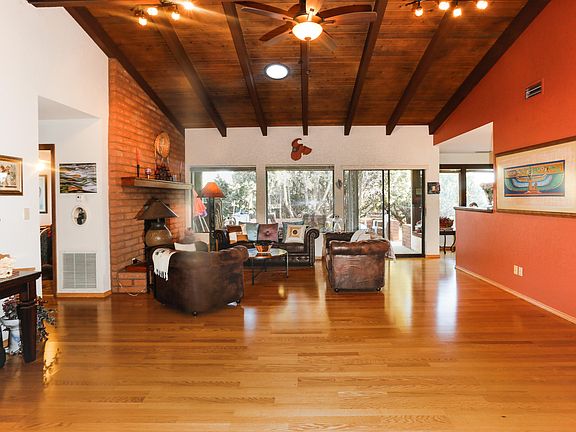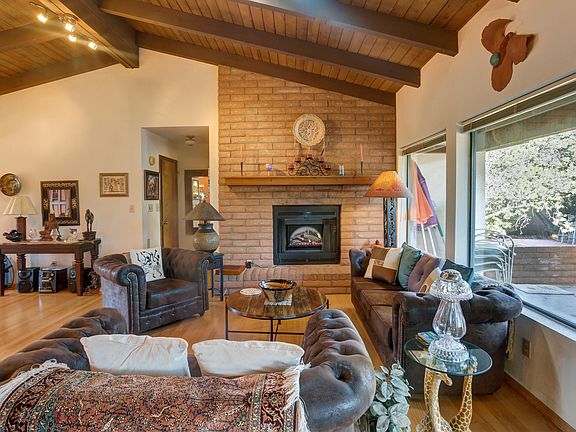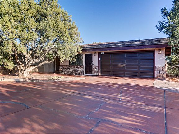 This single level home is nestled among junipers and pine trees on .65 acre on a quiet cul de sac high in the desirable Kachina subdivision of West Sedona. No HOA. Short term rentals ok. Expansive outdoor entertaining areas in parklike rear and side yard settings. Space on the side also for a garden...or a horse! Fully fenced yard is ideal for our 4 legged friends. Property extends back beyond the fence to Kachina Dr. Woodburning fireplace keeps it cozy. Lots of windows bring the outside in. Quiet, private but close to all the action in West Sedona. Walk to Library. Wood & tile floors are easy maintenance. One bedroom/bath has a private entrance and has been a successful Air BnB for 2 yrs. You'll probably want to update the kitchen. Dining rm light fixture does not convey.
