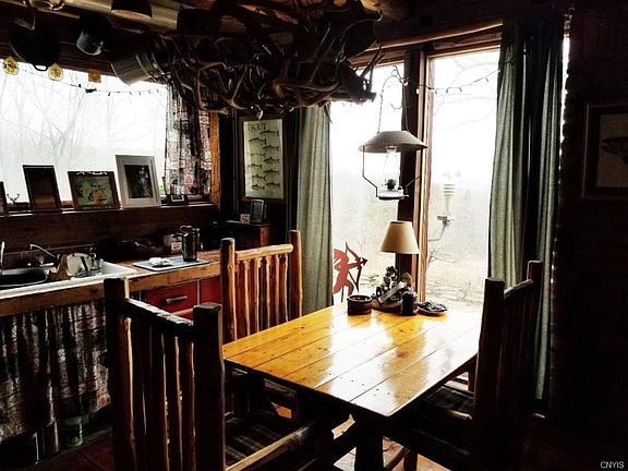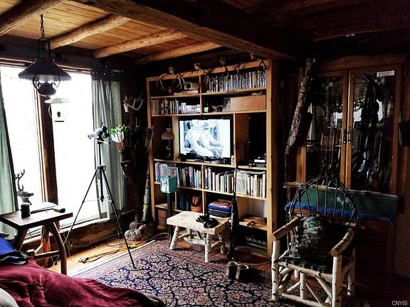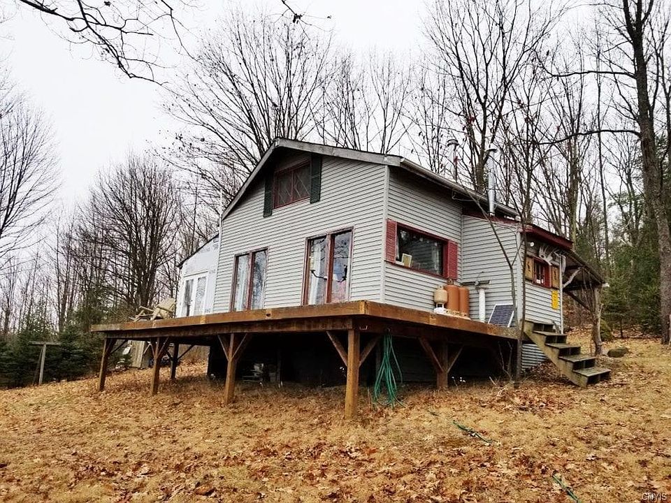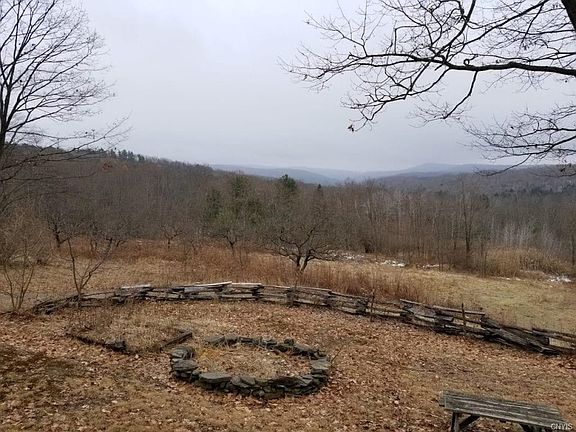 As you enter the property from the main road, the gravel driveway leads back over 1,600 feet through the woods and winds down a hillside to this secluded camp. The views from the cabin are amazing! You can see several distant hilltops stretching all the way into Pennsylvania. The cabin is constructed with reclaimed hand hewn barn beams and sits on 12 x 12 piers with low maintenance vinyl siding. When you step into the cabin it has a rustic feel to it with a large stone hearth behind the wood stove that was build from material found on site. The cabin is roughly 16 x 32 with a 3/4 sleeping loft. There is a full bathroom, drilled well and septic. The kitchen area has a sink and wood cook stove with a gas burner. The sale will include furnishings and 3 solar panels. Fully wired cabin.