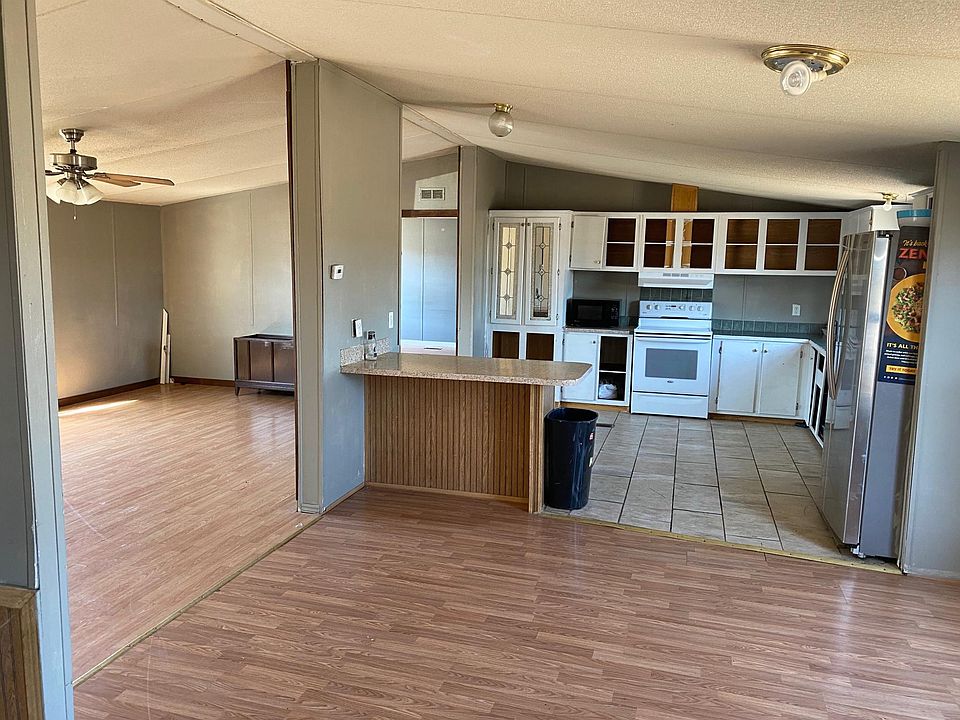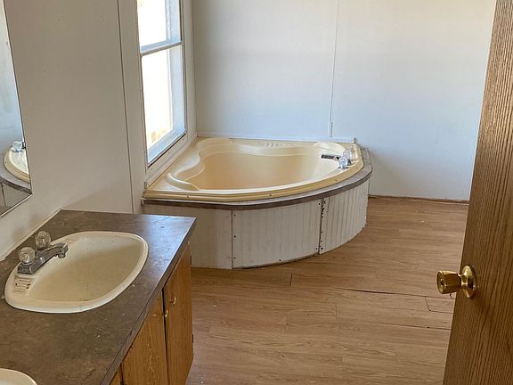 Doublewide on 3 acres, four bedrooms and two bath home with open floor plan, large kitchen with island, laminate floors throughout the house. Master bath is large with garden tub. Master bedroom has walk-in closet, and house has covered front and back deck.