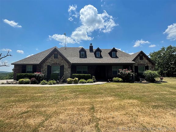 Custom 1 owner home on 8.3 acres, home sits on top of hill over looking Osage Hills, view as far as 412 Keystone Lake Bridge, with lots of privacy. Vaulted ceilings in living room with large windows and spectacular views, wood floors, large kitchen with granite, Private master with dual walk-ins, luxury tile shower. Huge bedrooms all with private baths. 2 extra rooms for Office and hobby room. Large covered porch, Patio covered and lot of space to entertain! Inground pool, 2 car garage. Shed for storage. Gated private drive. Back on market with no fault of sellers. House is move-in ready. Title ready for quick close.