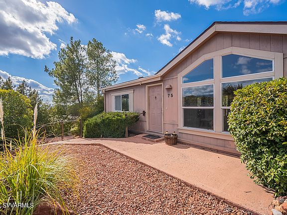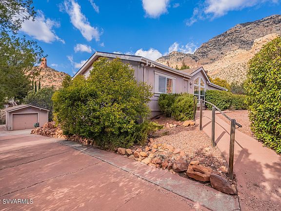Situated on a large .33 acre lot nestled beneath Thunder Mountain with spectacular red rock VIEWS! Prime location just a short walk from National Forest Land and great hiking trails. This split-bedroom 3 bed, 2 bath manufactured home comes with a brand new deck that expands along the entire rear of the home to enjoy those gorgeous Sedona sunsets while offering privacy in a perfectly treed, secluded environment. Upgrades include new roof, deck, and newer heating, cooling and hot water heater (less than 5 years old). Detached garage on the lower level of the property. No HOA.