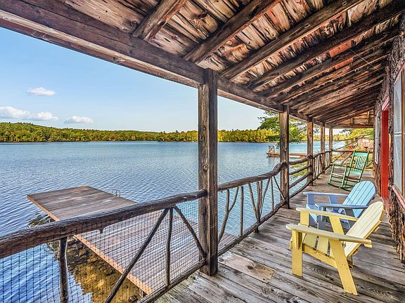LOVEJOY POND Magnificent custom built Maine lodge architecturally designed to provide that classic, rustic feel with all the modern day amenities & system! Originally the Menatoma Camp ''Lodge'' sadly destroyed in a fire, this 2001 structure was built to encompass everything it means to be in nature at the lake with loved ones! The central living room is a wonderful place to gather around the gorgeous natural stone fireplace that reaches to a lofty ceiling with grand staircases on each side. Open game room & two dedicated dining areas adjacent to a fully equipped kitchen is ideal for entertaining large groups. Office/den & laundry room with half bath complete the main level, while 4 spacious bedrooms, two full baths, 2 walk-in linen closets & a nice sitting area complete the second level. Outside is a covered porch, 2 open decks & a wonderful screen porch allowing you to enjoy the outdoors while listening to the loons. The property is made up of 2 separate lots with 400' of beautiful lakefront with a gently sloping, pebble bottom swim area & private dock which can be accessed by a park-like walking path through the woods, or your own private road. While surrounded by woodlands on 3.74 acres, the rest of the association's amenities next door can easily be accessed by footpath or road. Dues include access to over 36 acres, 770' of shared lakefront with a sandy beach, protected swimming area with float, 2 large permanent docks, swim float & diving platform, Dining Hall, Laundry Building, Craft Shop, Tennis/Basketball/Pickleball Courts, Baseball Field, dumpster, grounds & tree service. Lovejoy is a beautiful lake with no public boat ramp, no invasive aquatic plants & excellent sport fishing with breeding pairs of loons that raise chicks on the lake each year! Lodge is fully insulated, has an 18 panel solar array supporting all needs, private septic system & access high speed internet if desired. Welcome to a comfortable, easy life at the lake with room for all!