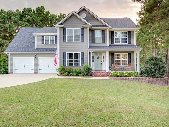 GORGEOUS HOME in a country setting, with a remodeled kitchen and convenient features, perfect for raising a family. Available for move-in 19 June 2019. 20 mins to Fort Bragg and less than an hour to Raleigh-Durham. Willing to pay buyer realtor fee. Hardwood floors throughout downstairs. Large master bedroom and master bath, kitchen and living room; large fenced back yard with deck and patio. Downstairs: Remodeled Kitchen with beautiful quartz countertops, premium stainless steel appliances, and hardwood cabinets (lots of space); dishwasher, refrigerator, microwave, electric oven/stove in the kitchen remain with house; large formal living room with propane fireplace; large formal dining room; sunroom with windows all around for lots of light and relaxing while viewing the large back yard and woods; 1/2 bath - powder room; large utility room between kitchen and garage with custom built-ins; ceiling fans in living room and sunroom. Upstairs: Large master bedroom with 2 large walk-in closets with plenty of space for clothes and shoes; large master bathroom with whirlpool tub, dual sink vanity with entire wall mirror, separate shower, and privacy room with toilet; 3 more bedrooms with ceiling fans; 2nd full bath with large vanity, single sink, and tub/shower; linen closet; laundry room. On Cul-de-sac. Other: Covered front porch perfect for your rocking chairs; storage in attic off master bedroom and plenty of storage in the garage on large built-ins wrapped around ceiling; large 2-car garage (room for 2 cars and storage/workspace); hardwood stairs to 2nd floor; vinyl siding; city water; septic tank; gutters all the way around the house; two-zone heat pump with smart thermostats (one for each floor); smoke alarms; cement double-wide driveway for plenty of parking.