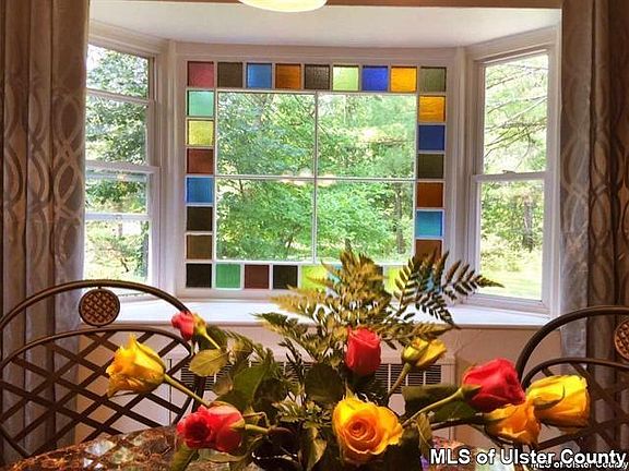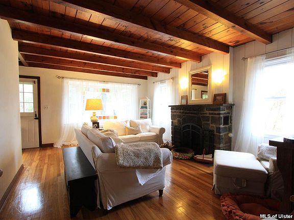 From the Dutch Entry Door to the Exposed Wooded Beams this Mid-Century Cape will charm you. The first floor has hardwood floors, beamed wooden ceilings, stained glass windows, built-in cabinets, lovely stone fireplace, formal dining room, remodeled kitchen, bedroom, full bath, laundry room & office. The second floor has two bedrooms and a half bath. This home sits on 1.5 acres of beautifully wooded grounds with a fenced in back yard, and stone patio. Ninety minutes from NYC enjoy the Shawangunk Mountains. Mountain Rest is just Minutes from the Village of New Paltz, Mohonk Preserve, Mohonk Mountain House, High Falls, Wineries, Apple Orchards, Popular Local Farms, SUNY and the NYS thruway. Updates include: a new kitchen with stainless steel appliances, new furnace, washer, dryer, water softener system, chimney redone, garage & entryway roof new in 2013. Kitchen has electric heat.