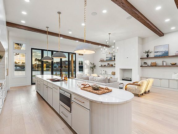 Outdoors, a private backyard oasis unfolds with a resort-style pool, spa, and full outdoor kitchen overlooking a tranquil pond, creating an ideal setting for relaxation and entertaining alike. Guests enjoy complete privacy in the carriage house above the garage, complete with its own entrance and full kitchen. The home's coastal architecture is elevated by natural stone accents, a grand auto court, and striking curb appeal throughout.