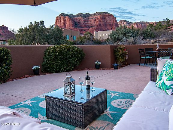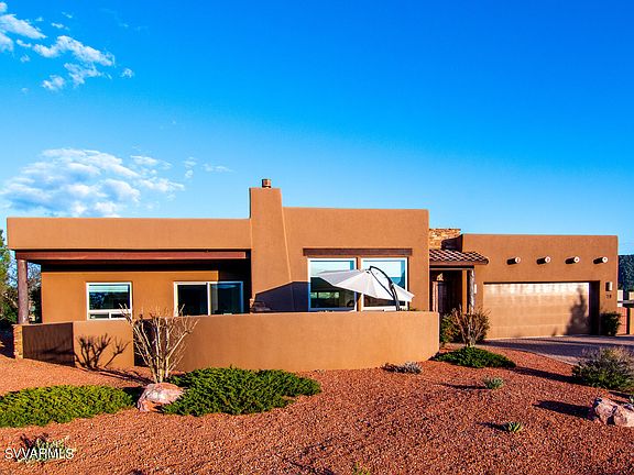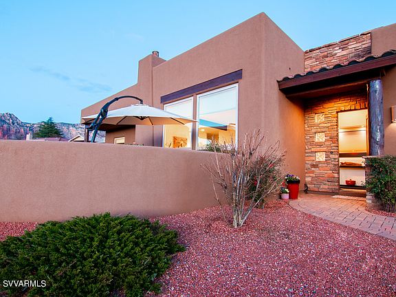 A beautiful southwest style custom build with high ceilings and stunning panoramic views of Castle Rock, Courthouse Butte, Bell Rock and more. The home was built with real intentionality. It features an intuitive layout and design taking full advantage of the oversized front courtyard to capture some of the best views in the area, plus a much more intimate rear patio sheltered by green trees offering a private space.