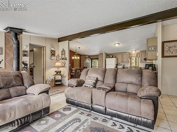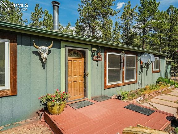 Welcome to this charming home nestled on a peaceful 2-acre wooded lot. As you arrive, you’ll be greeted by a circle drive and the inviting exterior, complete with wood trim accents around the windows. Step through the glass storm door into the mosaic tile entry, where you’ll immediately notice the warm and welcoming ambiance. The living room features a beautiful wood wall accent and a rustic wood beam, perfectly complementing the cozy wood-burning stove. Moving into the heart of the home, the kitchen boasts plentiful cabinetry, brand new sink faucet and range oven, and a peninsula countertop with additional seating for entertaining. The cohesive tile flooring throughout the main living areas and bathrooms offer a seamless and practical design, while the bedrooms feature wood vinyl. The master suite is a true retreat, boasting wood wall accents, a spacious layout, and an en suite bathroom. Relax in the soaking tub or refresh in the standing shower, all of which is fully private from the rest of the home. The two guest bedrooms and full guest bath are on the opposite side of the home, ensuring privacy for guests. Step outside onto the recently redone dual-level deck that stretches the full length of the home, perfect for hosting friends or enjoying quiet evenings. The fenced side yard is an ideal space for pets to roam, while a storage shed and carport add convenience. With storm doors at the front and back, the home is filled with natural light and the refreshing breeze of the surrounding wooded landscape. Brand new water heater since listing! Located just minutes from the amenities of Florissant, 30 minutes to Woodland Park, and 30 minutes to Cripple Creek’s 24-hour gaming, dining, and entertainment, you’ll have plenty of options for nearby activities. Plus, world-class skiing is just an hour and a half away. This property offers the perfect blend of mountain living, convenience, and rustic charm—an ideal escape to call home. Make it yours today!