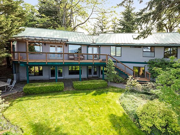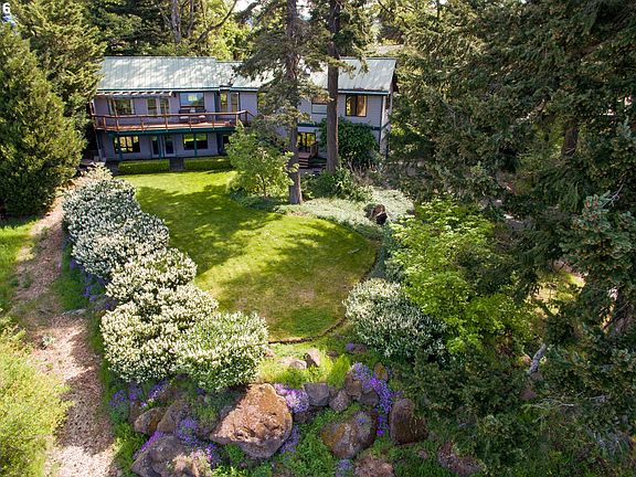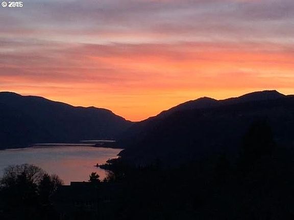 Spectacular West Shot View of the Columbia River; Amazing morning, noon & night! Light filled, vaulted great room with huge central island, gas fp,& French doors to deck. Reverse floor plan; great room up with Master suite, 2nd bedrm & 2nd bath. Big family rm, 3rd bedroom & bath on ground. Gorgeous yard; mature plantings & huge trees line the driveway. Indoor outdoor living. PRIVACY! A Retreat on.33 of an acre! VIEWS!!