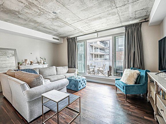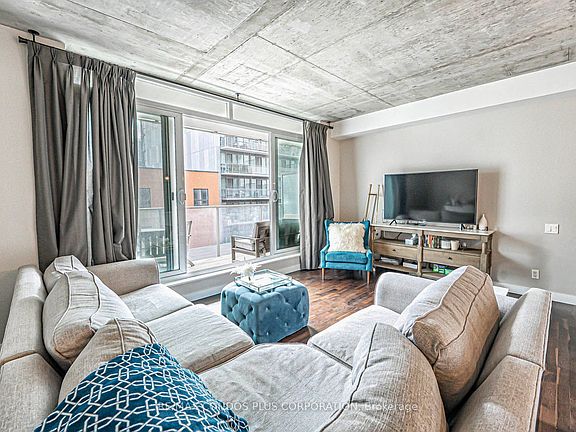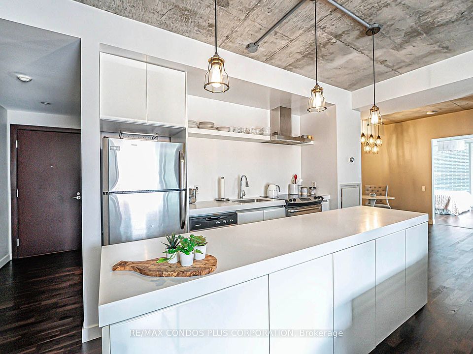 Experience the best of King West Loft living at Seventy5 Portland. This supersized 1-Bedroom + Den, 2-bathroom corner suite is where bold design meets unbeatable lifestyle. Relax & Unwind with almost 1,000 SF of modern, open-concept space curated for both function and flair. Enjoy Soaring 9-ft exposed concrete ceilings, and south-facing floor-to-ceiling windows that flood the home with natural light. White Modern Cabinetry, Hardwood Floors, Quartz Countertops & Full-sized Stainless Steel Appliances accent an Oversized Kitchen Island that creates a stylish hub perfect for everyday living or effortless entertaining. Retreat to your king-sized Primary Bedroom, complete with a large walk-in closet and a luxurious 4-piece ensuite featuring a Soaker Tub and separate glass-enclosed shower. The versatile 11.28 Ft x 10 Ft den with a full window offers the ideal flex space for a second bedroom, home office, gym or creative studio. Step out through the Double Glass Sliding Doors to your private south-facing terrace with a gas BBQ hookup with City & Sunset Views. This is the ultimate urban oasis where you can relax, entertain, and soak in the city skyline. Perfectly positioned in Toronto's thriving Fashion District, you're steps to King Street West, Victoria Memorial Square Park, Shops & Restaurants at The Well, Queen West, world-class dining, and even Billy Bishop Airport & the Waterfront Trails. 100/100 Walk & Transit Score! Parking, Locker, and Bicycle Rack included...because true downtown living shouldn't mean making any compromises. Ready to elevate your lifestyle? Suite 424 isn't just a condo, it's your next great chapter in refined Urban Living. See Video Tour for more.