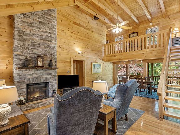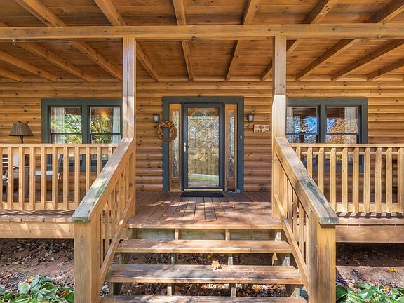 A real log cabin with an unexpected treat: an in-ground salt water pool and gazebo! This updated modern cabin is nestled on 2.44 acres in the quiet gated Mountain Creek Hollow community. The rocking chair porch invites you into the great room w/ a vaulted ceiling and stack stone fireplace. The open floorplan into the large dining room and white kitchen features stone counters, and cozy breakfast room. The owner's suite also has a vaulted ceiling with its own private loft! Master bath has dbl sinks, oversized shower, soaking tub and walk-in closets. The 2 guest rooms on the other side of the home share a hall bath. Upstairs is an oversized office with a half bath. Plenty of storage in closets upstairs. The large laundry room is on the main floor leading out to the 2 car garage, plus the full unfinished basement with a workshop, and boat door. There is opportunity for expansion! See it today!