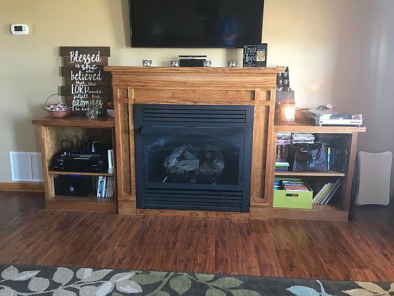Open floor plan. Large yard with privacy. Laminate flooring in main areas. Tile in bathrooms and laundry room. Custom built propane fireplace with shelving. Roof replaced 2018. Shed for lawnmower and other storage