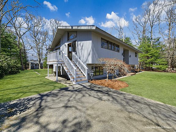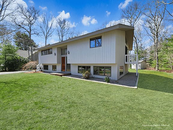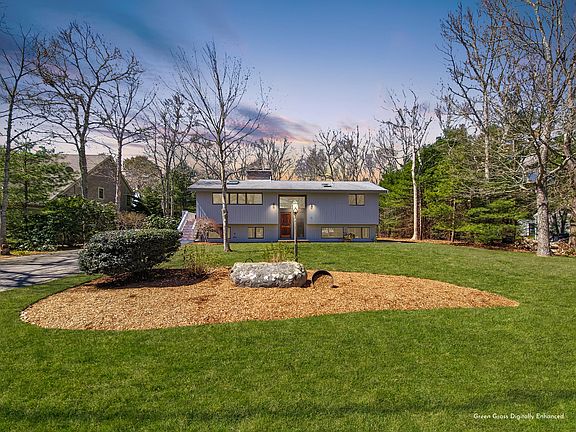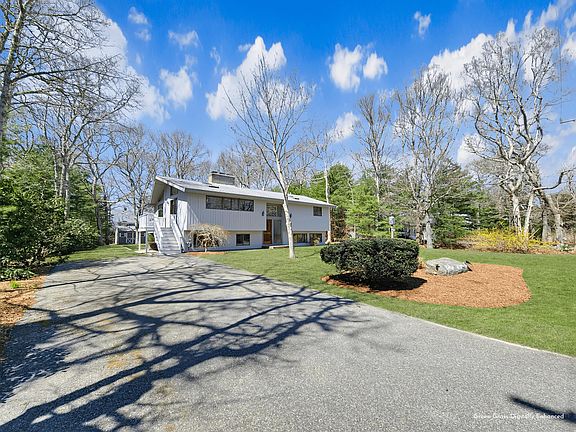 Discover the charm of Seapit Peninsula in this 2488 sqft, 3-beds, 2.5-baths split-level contemporary home, perfectly positioned midway between downtown Falmouth and Mashpee Commons. Across from the public Waquoit Bay Town Landing, enjoy easy boat launch access to the ocean and proximity to the private Waquoit Bay Yacht Club. It has been lovingly maintained with a recent full interior and exterior repaint. It features a first-floor primary bedroom with en-suite, wood-burning brick fireplaces in the living room and lower level den, vaulted ceilings with exposed beams, and generous natural light throughout. Three wall-to-wall sliders open a large deck with views of the expansive backyard with a stone retaining wall, perfect for summer outdoor enjoyment. An antique wooden front door with a one-of-a-kind hand-carved inlay enhances the distinct character of this unique home. This property is not just a house, but a versatile opportunity, perfect as a savvy investment, a seasonal retreat, or a year-round residence.