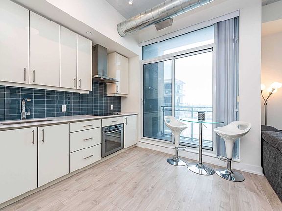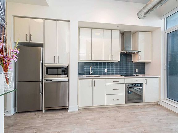 Conveniently Located,Modern,Well Maintained Building!Sparkling Clean And Bright Unit Is Available For Immediate Possession.Unobstructed North View!10 Ft Exposed Concrete Ceilings,Floor To Ceiling Large Windows.Grey Oak Laminate Floor Throughout.Open Concept Kitchen,Granite Countertop.B/I Stainless Steel Appliances.Glass Tile Backsplash.Underground Visitor Parking. Security Guard. Modern Amenities. Parking And Locker Included.