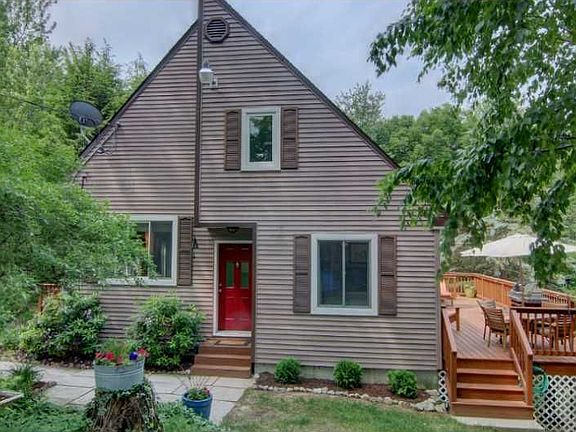 Charming 3 bed, 2 bath Contemporary cottage rests on over an acre of wooded land. An open concept w/ vaulted ceilings, slate tile floors, living room w/ wood stove & adjoining dining area. Kitchen has custom wood cabinets, SS appliances & granite.