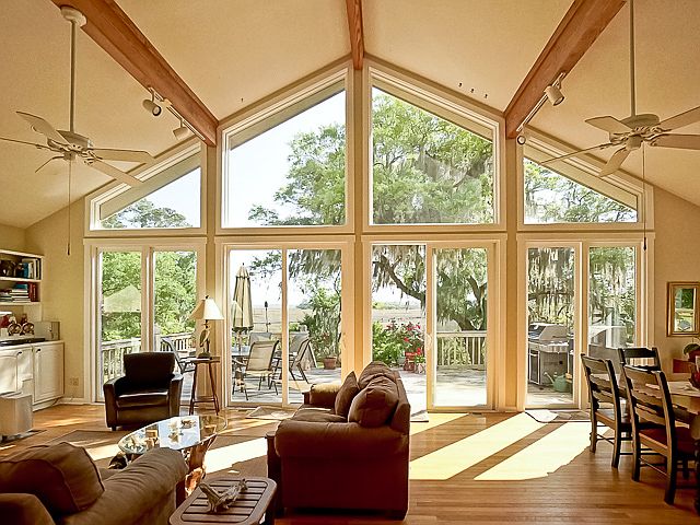 WOW!! Stunning water and marsh views from this meticulously maintained one-story home. This is truly the picture perfect of Lowcountry living!! Sitting on 0.80 acre with 158 ft. of water frontage, it offers lots of privacy. This home features a very open floor plan, open U-shape kitchen with new granite counter tops, fairly new appliances, ton of storage, oak wood floors in living areas, wood fireplace, and an entire wall of windows to bring in the natural light and the splendid outdoor. A huge deck from the living area, ideal for BBQ and entertaining, overlooks the backyard dotted with splendid live oaks draped with Spanish moss, the marsh and the ICW. Another deck off the master suite offers the same breathtaking views. With no neighbor on one side ever (community area), you are simply surrounded by natural beauty, birds, wildlife and deer. Kayak right from the backyard. An outdoor shower is ideal to clean off after a day on the water shrimping/crabbing. Very friendly mixed community. Amenities include an awesome golf course, a clubhouse, two tennis courts, a salt water pool complex and six miles to walk, run and bike.