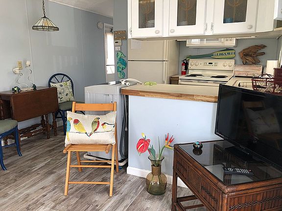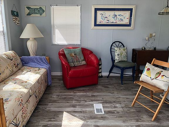Sweet manufactured beach house in 55+ community. Single wide home in excellent move in condition. 10ft wide by 36ft long. LR 12x10 ft. kitchen 10x9ft, bedroom 12x10ft. Front and backyard patio areas, furnished, including sleep sofa. Newer hot water heater, newer central air (both only 2 years old), new floors throughout. Washer/dryer included. Out building with 3/4 bath remodeled 2020. $713 quarterly HOA fee includes water, sewer, trash, outside ground maintenance. Community amenities include clubhouse, swimming pool, beach and marina, boat slips available for rent.
