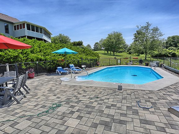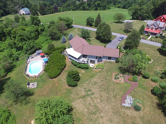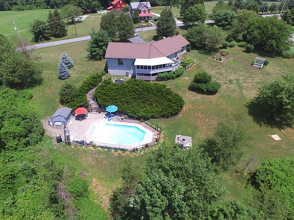 Located on 3.09 acres with a spectacular view. Almost 3,000 square feet of finished living area featuring an open floor plan with cathedral ceilings, a stone fireplace, large living room, formal dining room, kitchen with pantry and appliances, family room, screened porch, 2 master suites, stamped concrete patio surrounding the in-ground pool, over-sized garage, BBQ pit and many more amenities. Too numerous to list.