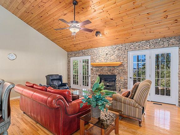 Imagine starting your morning with a cup of coffee on the back screened-in porch, soaking in the peaceful year-round mountain view. In the evenings, unwind while watching the sky glow orange as the sun sets behind the ridgeline. Step inside and you're greeted by a striking stacked stone fireplace that anchors the living area. The tongue and groove ceiling give the space that cozy mountain cabin feel, while large windows and doors bring in natural light and frame the views. The main floor offers an open layout with the kitchen, dining, and living areas flowing together—perfect for everyday living or entertaining. The master bedroom is tucked just down the hall and features private access to the back deck, ideal for enjoying the scenery in peace. Two additional bedrooms and a full bath are also on this level, along with a spacious laundry room and a two-car garage for convenience. Head downstairs and you'll find even more space to enjoy. The finished basement includes a large den with another fireplace, ideal for a movie room, game room, or even a quiet reading nook. There's also a private bedroom and bath for guests, plus a flexible bonus room that could work as a fifth bedroom, craft space, office, or small workshop. The lower patio is a poured concrete pad—just right for a hot tub or spa with a view. Updates include a brand new HVAC system and a new retaining wall for added peace of mind. Located in the gated Walnut Mountain community, you'll enjoy access to swimming, recently resurfaced tennis and pickleball courts, a garden club, side-by-side club, music jam sessions, cookouts, and more. Relax with a book from the community library or fish along Turniptown Creek. HOA dues cover water, trash, and recycling, making it easy to settle in and enjoy. Schedule your private tour today and see what mountain living is all about.