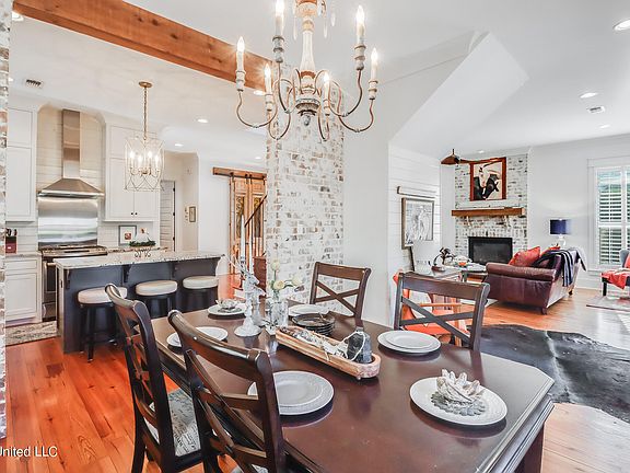 Home features heart pine floors thru-out except in utility room and bathrooms which have porcelain tile; brick wall in formal dining room with cedar beam over entrance into kitchen, brick front fireplace from floor to ceiling with cedar beam mantel, old reclaimed wood doors over doorway into utility room and all interior doors are 8 foot; custom kitchen cabinets go to ceiling with inset doors and large island has the microwave inset; both upper bedrooms have access to balcony with a fantastic view of Gulf; all three bedrooms have bathrooms and large walk-in closets; whole house generator; rear entry to double car garage; there is separate water bill for watering lawn;