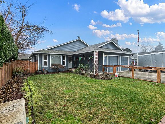Check out this charming home in a quiet Thurston neighborhood. This single level home is move-in ready and has been tastefully updated. Some updates include newer exterior paint, kitchen cabinets, tile, flooring and bathroom cabinets. This lovely home offers 3 bedrooms, 2 bathrooms, vaulted ceilings in the main living area, hickory cabinets and stainless steel appliances in the kitchen. Beautiful engineered hardwood flooring throughout with carpet in the bedrooms, indoor laundry, and a wood burning fireplace. The primary bedroom offers an en suite with a walk in shower. Outside you will find a covered patio, a fully fenced yard with in-ground sprinklers, 2 car attached garage and covered RV parking area. This home has a lot to offer and is in a great neighborhood. Schedule a showing to see it in person!