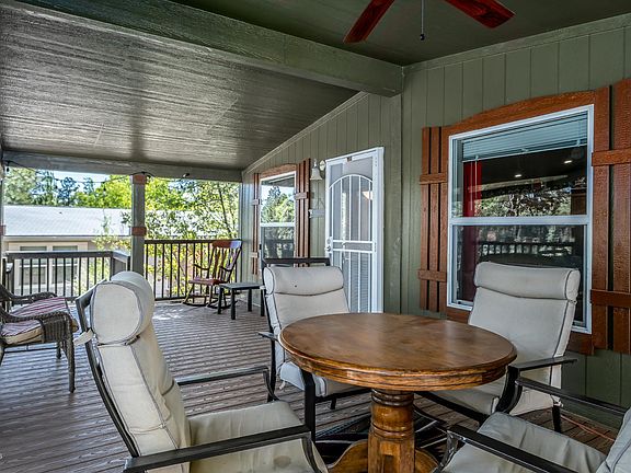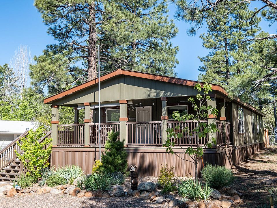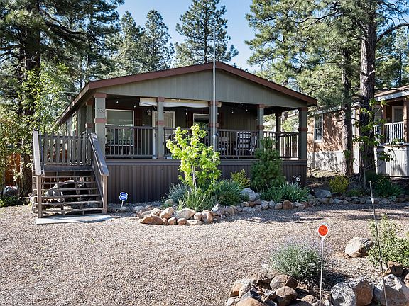 Simply Gorgeous 2018 Cavco Home with all the upgrades. Home features covered front deck and back patio. As you walk into the home you are welcomed into an inviting open concept with a cozy living room, wood fireplace and vaulted ceilings. Kitchen has open bar/breakfast bar, granite style appearance countertops, and stainless steel appliances. Master bedroom features large open space with dual sink master bath and large closet. Bedroom(s) 2 and 3 are both generously sized. Large separate laundry room with cabinet and storage. Wood laminate flooring in Kitchen, Dining and Bathrooms. Warm carpet in living and bedrooms. Property is partially fenced with privacy. Enjoy the beauty of Munds Park while sitting on the covered deck every morning. A must see!!
