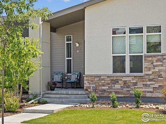 Ranch-style, west-facing home with park views and striking modern butterfly roof design. Enjoy bright, single-level, low-maintenance living with 10' & vaulted ceilings, large windows, and an open floor plan. The gourmet kitchen features KitchenCraft cabinetry, quartz countertops, Whirlpool appliances, undermount sink, and a spacious island. Luxurious primary suite includes a 5-piece bath with freestanding tub. Stylish EVP flooring throughout main living spaces. Upgrades include living room fireplace, patio trellis, and gourmet kitchen package. Energy-efficient with central A/C, Navien tankless water heater, and smart thermostat. Optional basement finish offers potential for additional bedroom, bath, and rec room. Overlooking the neighborhood park, this home blends modern design, comfort, and Colorado living in one thoughtfully designed space.