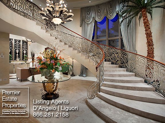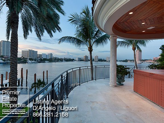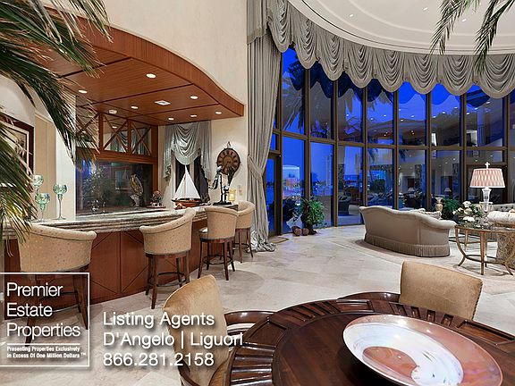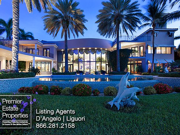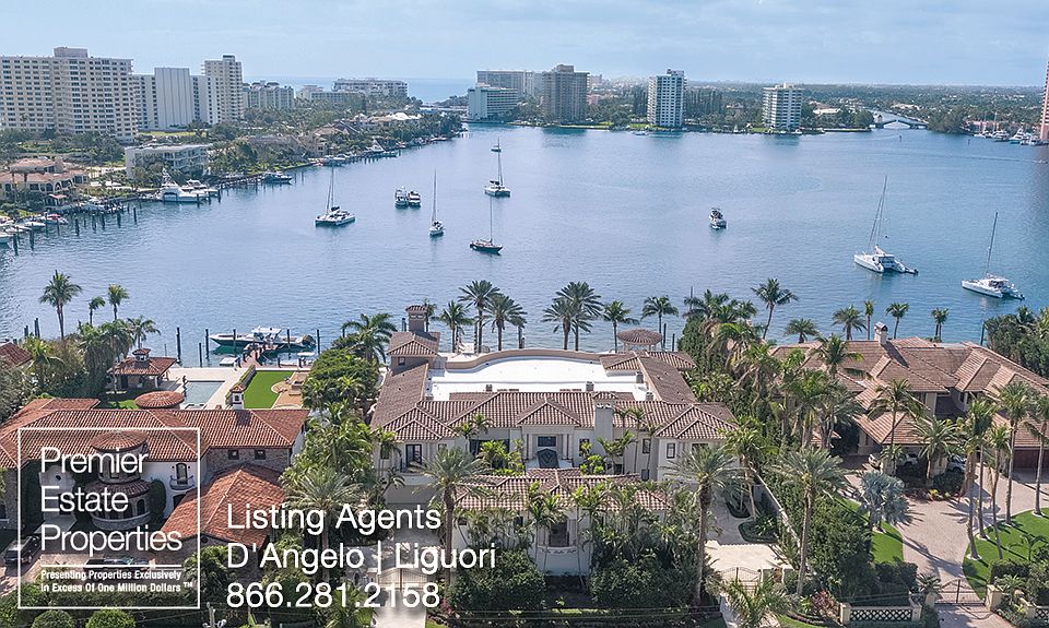 One of Lake Boca Raton's best viewpoints is reserved for this imposing gated compound on 150+/- feet of shoreline, looking all the way down the water and surrounding coastline to the historic Boca Raton Resort & Club. Unobtrusively placed to the side, the rare cut-in yacht slip is large enough for a 120+/--foot vessel and is close to the inlet. Additional dockage can berth another 75+/--foot yacht. Designed for large-scale gatherings, the sensational outdoor entertainment space centers on the 63+/--foot infinity pool and grand loggia with a summer kitchen/bar, cabana bath, and boat equipment storage. Exotic Medjool date palms are signature elements of the lush tropical landscaping.