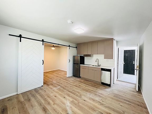 Located adjacent to West Hollywood, this newly remodeled upper-level Jr 1-bedroom is a must-see! The apartment features stunning brand-new flooring throughout. The living area seamlessly opens to a cozy kitchen, equipped with a brand-new stainless steel fridge, electric stovetop, and stainless steel dishwasher. An A/C unit in the living room ensures comfort year-round.