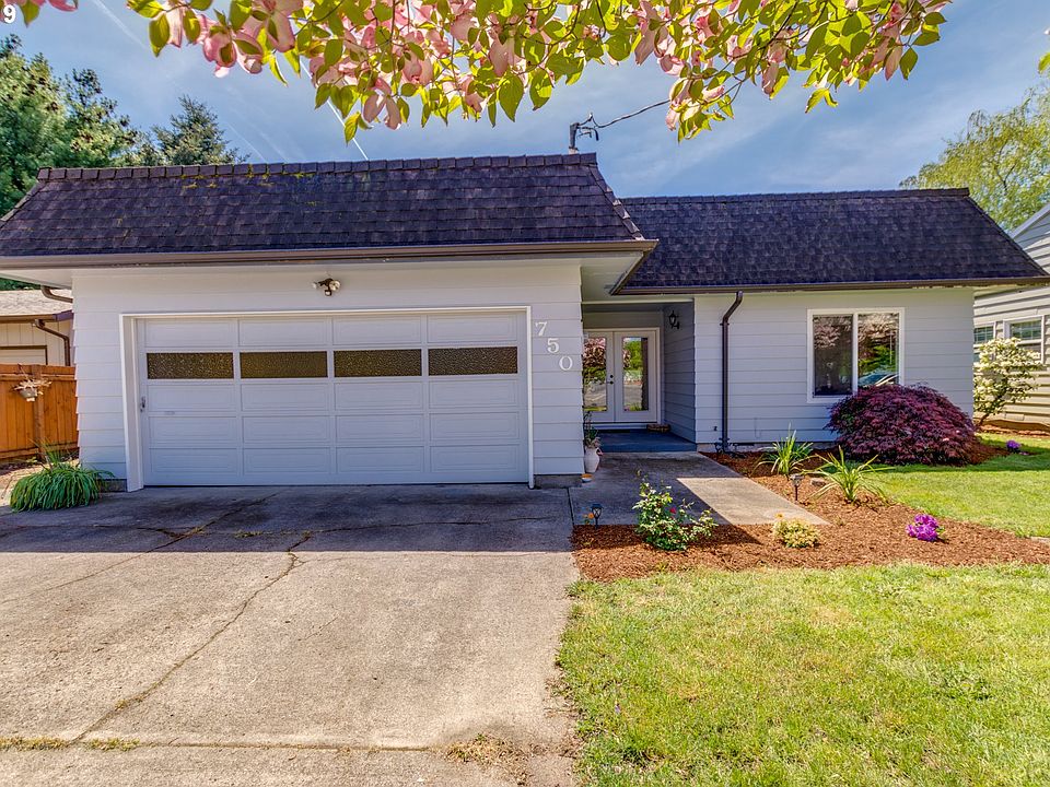 One level living home featuring 3 bedrooms and 2 bathrooms. Cherry hardwood floors in living room with brick fireplace, skylights and ductless heat and A/C. Butcher block countertops in kitchen w/view to large, fenced backyard with covered deck with skylight & hot tub! Newer exterior paint, siding and roof. 2 car garage, RV/boat parking. Plenty of storage in garage & attic. Convenient location next to McMinnville High School!