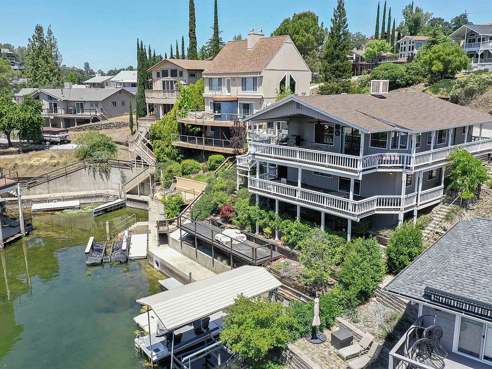 Lakefront Living at Its Finest on Lake Tulloch! Welcome to your dream retreat in the Sierra Foothills! A stunning lakefront home offering the ultimate in comfort, recreation, and breathtaking views. Nestled on the shores of Lake Tulloch, this spacious and open-concept residence boasts its own private dock, complete with a boat hoist and two jet ski docks, providing easy access to the water any time you like. Step inside to find an inviting layout featuring three bedrooms, two fireplaces, and a dedicated game room with a full bar and shuffleboard, perfect for entertaining family and friends. Enjoy beautiful hardwood floors throughout, a chef’s kitchen with granite slab countertops, stainless steel appliances, and plenty of space to gather and unwind. Wake up to tranquil lake views and sip your morning coffee from the charming round bay windows, or relax in the evening as the sky lights up with gorgeous sunsets. Soak in the hot tub after a day on the water, or take in the sights from two expansive levels of decking, ideal for grilling, lounging, or stargazing. Bring all your toys, too. the oversized 3-car garage and flat driveway offer ample room for your boat or trailer. Whether you're looking for a weekend escape or a full-time lakefront lifestyle, this Lake Tulloch gem delivers!