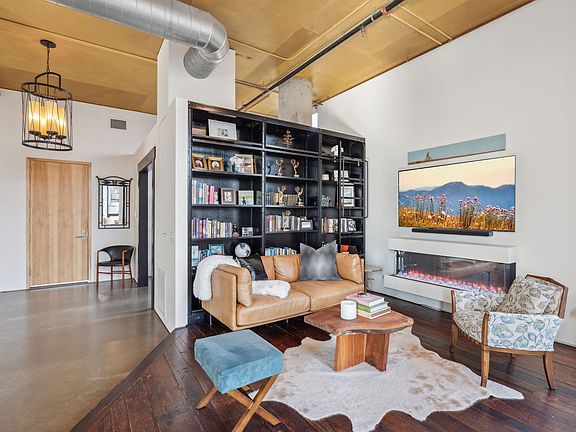 A luxe owner’s suite with custom closet and beautiful custom mosaic floor in the spa bath, a spacious home office, second flex-bedroom, storage room with custom built-ins, and two oversized parking spaces with electric vehicle charger. A riverside balcony with gas line and views to the river. This is a perfect mix of modern loft living in the heart of the
