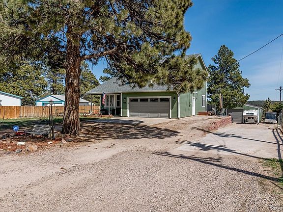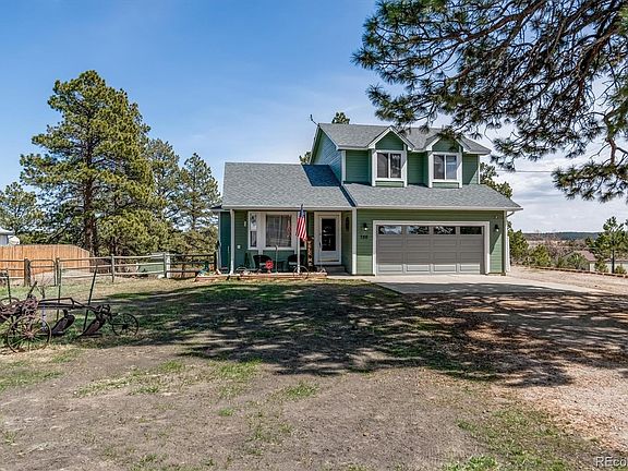 Location, location, location! Country living with the conveniences of town. Walking distance to grocery, schools, parks, and food in the historic downtown Elizabeth. 4 bed, 4 bath, 2 story home on a large lot! Enjoy the mature pine trees and mountain views! This home features a large master suite with attached primary bathroom. Two additional bedrooms that have views of Pikes Peak, and share a full bath finish off the upper level. Walk in on the main floor to a cozy living room with a gas log fireplace and open to the dining room. The large kitchen features an eat in space with country views and lots of natural light. Enjoy meals out on the expansive deck off the kitchen. The highlights of the walk out basement include a large family area, bedroom and full bathroom. Enjoy the essence of country living with no HOA and a large detached garage, 32x32!! The lot is just over a half acre and fully fenced with an access gate.