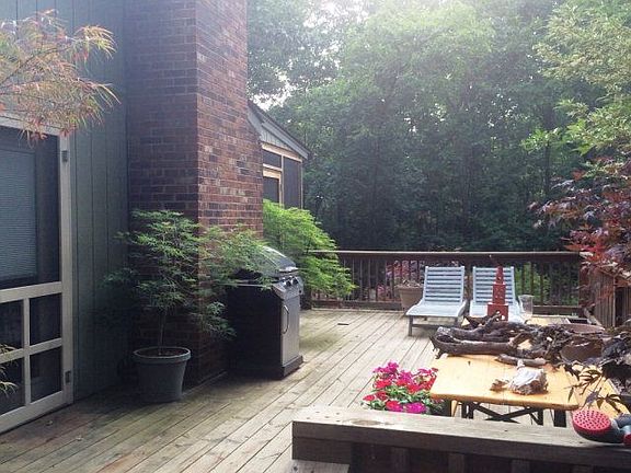 Beautifully updated and upgraded retreat...The perfect tranquil get away!!! FULLY renovated - layout redesigned, new windows, tankless gas water heater, paint, roof, Elm floors, drywall, plumbing, electric, lighting, skylights, gas heating unit, free-standing gas stove/fireplace, wood burning fireplace slate tile, laundry, KITCHEN: LG hi-mac solid surface counter tops with quartz, new sink ,cabinets, island, stainless steel appliances, and built-in breakfast nook (banquette), BATHROOM 1: Italian Glass Tile shower surround and flooring, custom vanity. BATHROOM 2: Slate shower and floor, custom vanity. Amazing outdoor spaces, including a new screened porch, new deck and cleared woodland walking path. TV, DVD, stereo, and 4 sets of built in speakers will convey. Porch swing will convey.