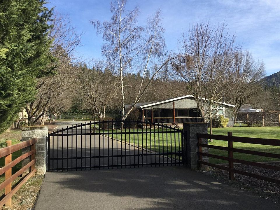 Gorgeous home with acreage less than one mile from town. The beautiful 2,640 sq ft home boasts 3 large bedrooms, 3 full baths, an office, modern kitchen complete with ALL appliances (including washer and dryer in the laundry room). 2 Master Bedrooms; 2nd master has a door leading to a its own private fenced lawn area - great for a mother-in-law setup. The 3-car over-sized garage has an abundance of storage space; add to that a covered car port and additional parking for your boat or RV. Security gate entrance, paved drive, lush lawn, mature walnut trees, manicured landscaping - all fully fenced. 16 GPM well when drilled. Live in your own park-like setting or enjoy nearby Palmerton Park Arboretum and the Greenway path along the Rogue River. Must see to appreciate.