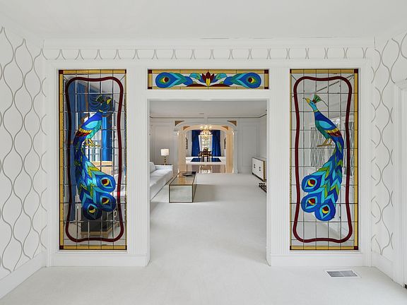The stately stone exterior—accented by signature columns and green shutters—makes a striking first impression. Inside, richly detailed interiors include stained glass accents, formal living and dining rooms adorned with custom trim work and a crystal chandelier, and specialty spaces like a themed den and a sound-ready music lounge—perfect for entertaining.