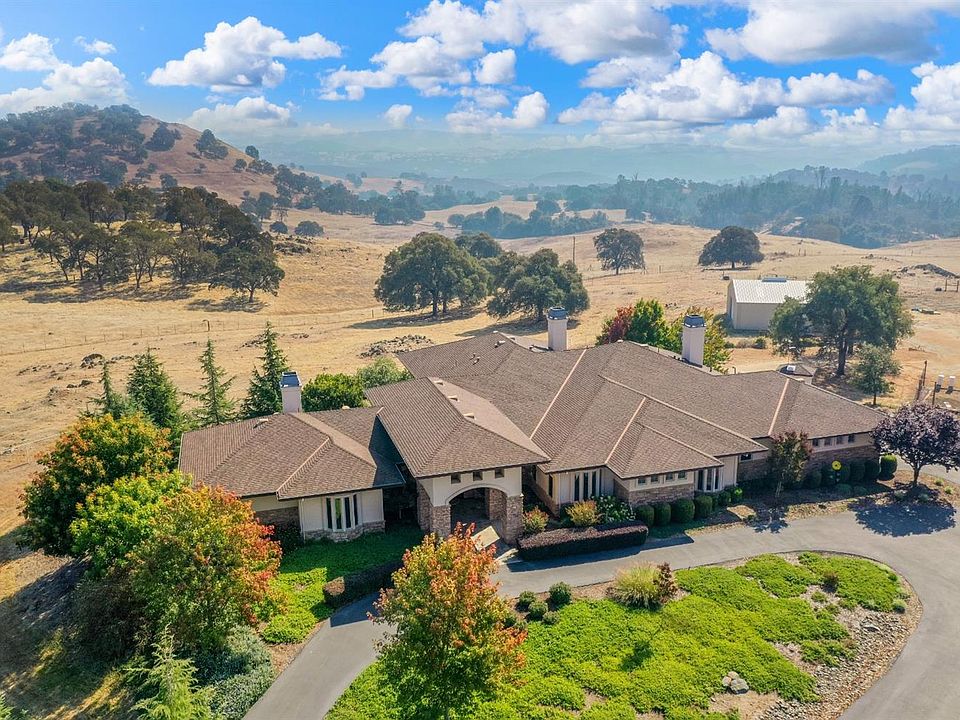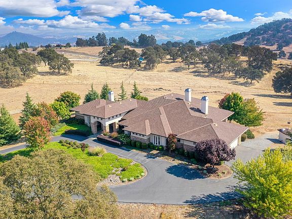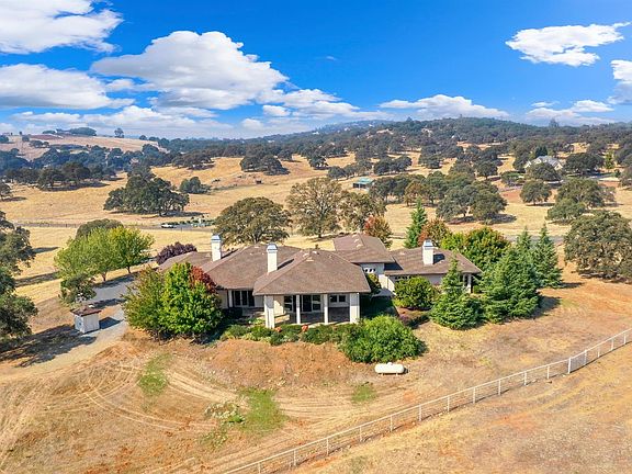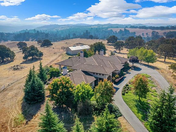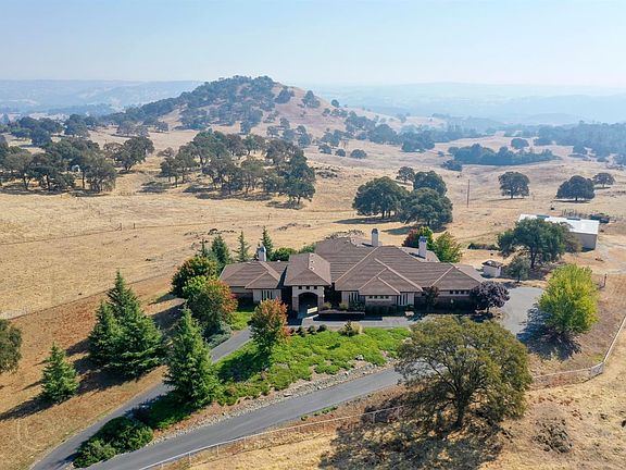 Elegant Country Living on 46 Beautiful acres with Mountain Views This dream home was built with meticulous attention to detail. Gourmet kitchen/family room gas fireplace, opens to a large covered patio. The game room has a wet bar, fridge, built in lrg screen TV, and a gas fireplace. The formal dinning room features 16 ft ceilings, a butlers pantry and built in storage. The 4757 sq ft one story home features 3 master bedrooms, office - the main Master contains a fireplace, sitting area, jetted tub, large shower, walk in closet with built-ins+island. Radiant floor heat throughout, 11 thermostats, and 3 A/C units. There is a 3-car extra deep garage - a 40 X 60 metal shop with 2 12 ft roll ups + drive through. The property is usable, completely fenced and cross fenced. It has been cattle grazed and is park-like. Property is adjacent to the El Dorado Trail with miles of riding trails. Many personal items are included - Call for more info.
