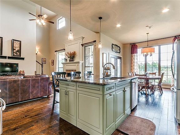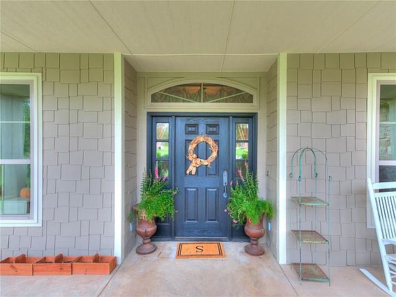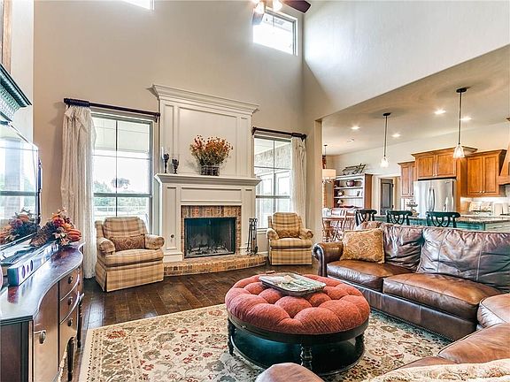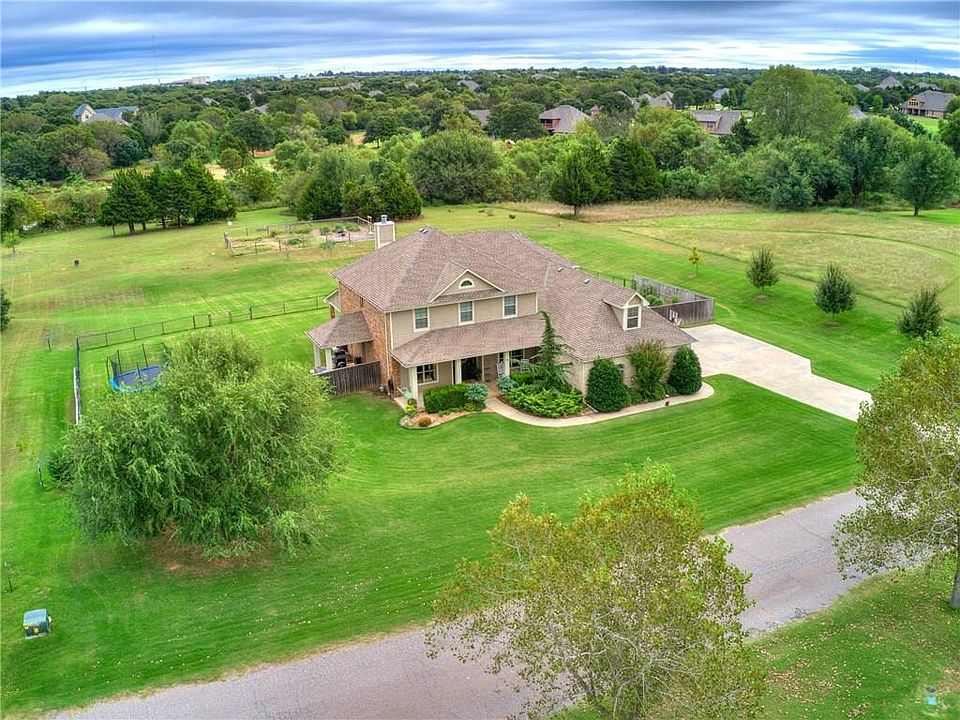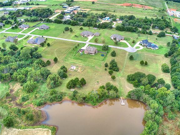 Welcome home to 7450 Falcon Ridge! This wonderful home is located on 2.3 acres in North Edmond. It has 4 bedrooms, 3.5 bathrooms, 2 living areas, 2 dining areas & bonus room. The kitchen is open to the living & features a large island, spacious eat in & butlers pantry. With a gas range & double oven, this is one for the chef in the family. The master bedroom has a private patio for a couple's retreat. The master bathroom features an extra large soaking tub, solid stone walk in shower & double vanities. Upstairs you will find 3 secondary bedrooms. One has its own private bathroom, the other two share a jack & jill bathroom with double vanities & walk in shower. You will also find a large bonus room upstairs, with walk in attic access. The garage is oversized, leaving lots of room for work benches & there's also a large storm shelter. And don't forget the pond in your backyard, with room for a shop!! This home has lots of upgraded features...don't miss out on this one!!!