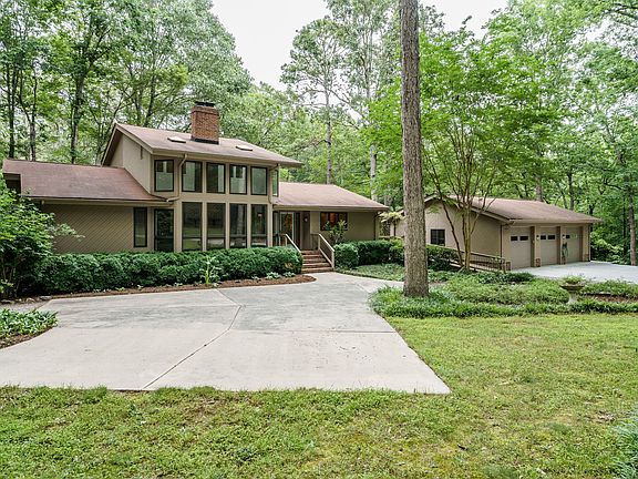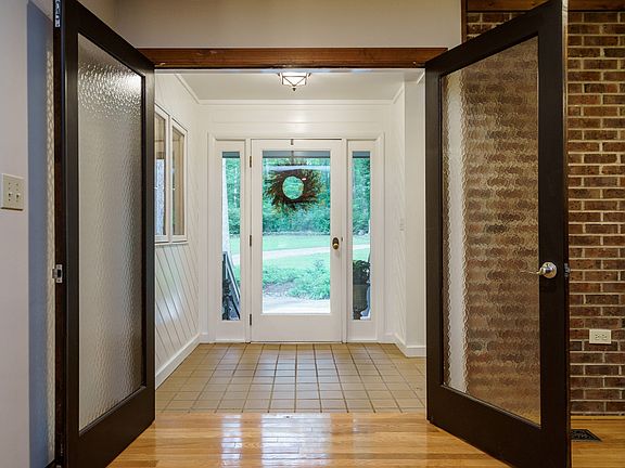 Custom private homestead in North Raleigh for the avid gardener or the practical prepper. This modern home was designed for passive solar heating and to take advantage of the gorgeous property - a natural pond with fishing dock, a shooting range, a coy pond with waterfall, and a large greenhouse with coop (say hi to the ducks when you visit) are spread across 4 acres of pines and hardwoods. Current driveway is off of Stony Hill, but would be super simple to create a private drive from Traders Trail!